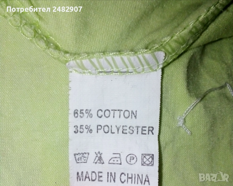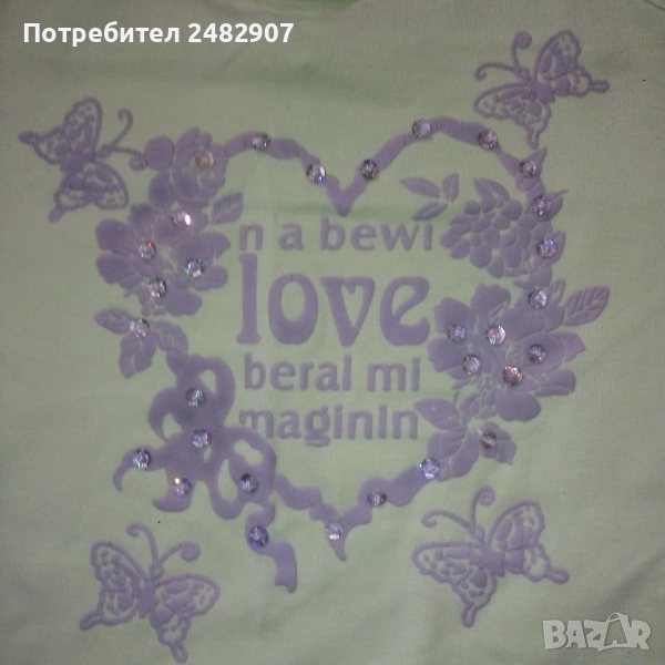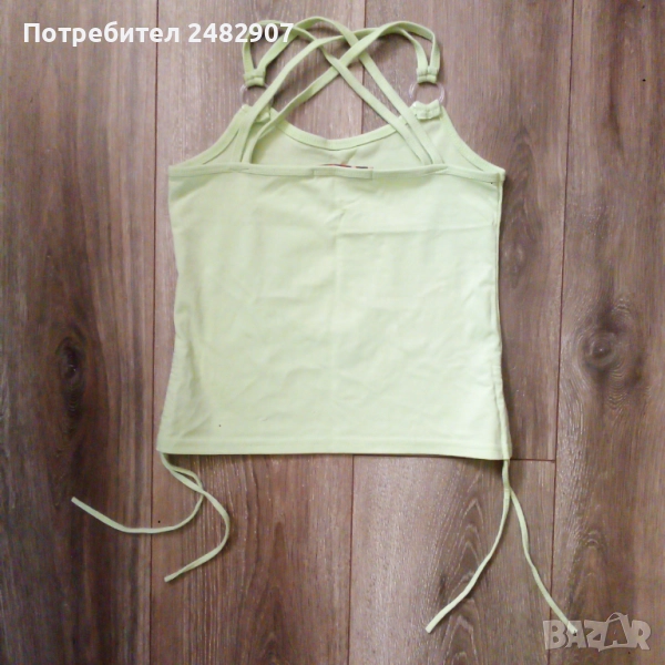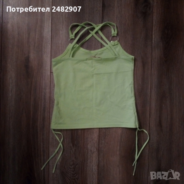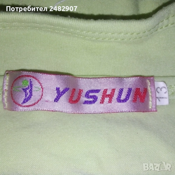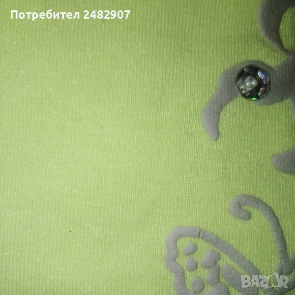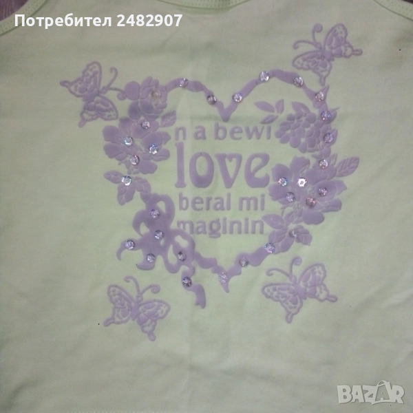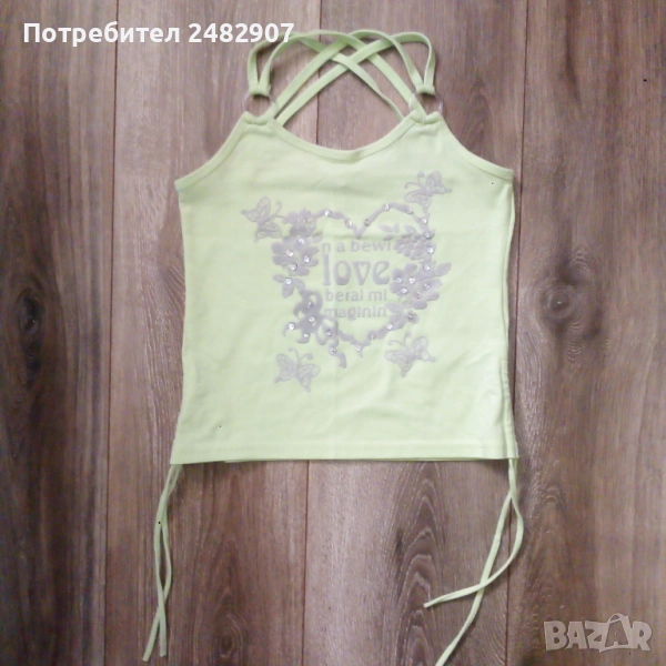 Бледо зелен детски потник с щампа и пайети за възраст 12-13 години. Съдържа 65 % памук и 35 % полиестер. Ширина под мишниците - 32 см, ширина в долната част - 35 см, дължина от горната част на презрамките до долу - 41 см. Много запазен, почти не е използван, с регулируеми връзки отстрани и кръстосани презрамки на гърба.