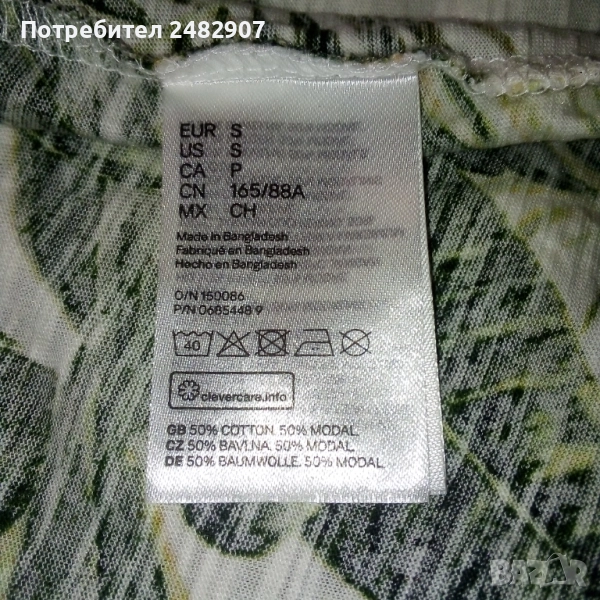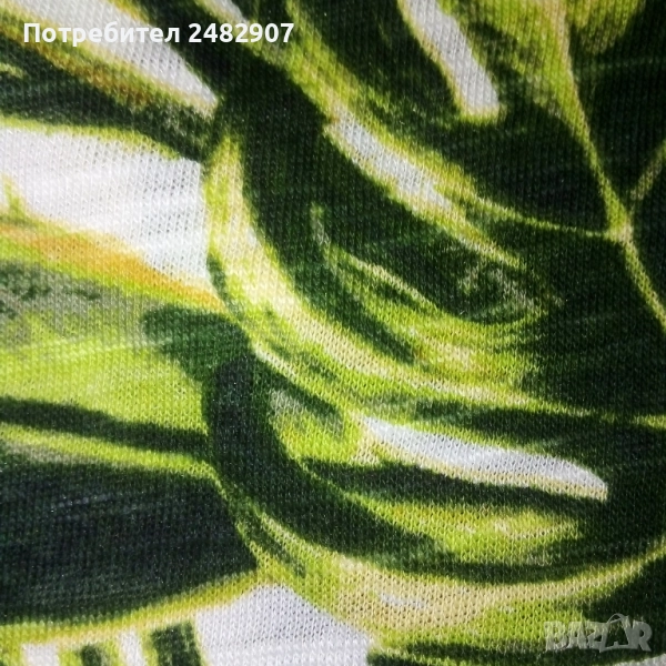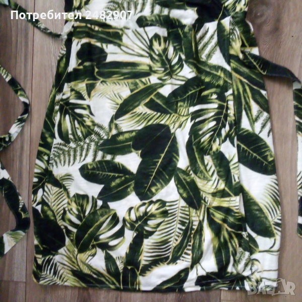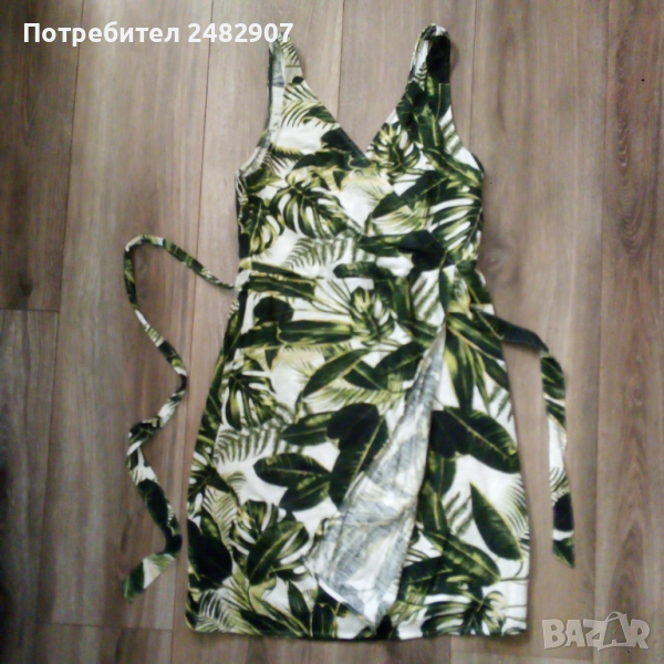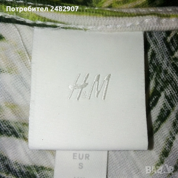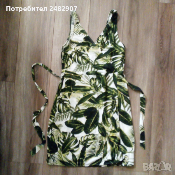 Дамска рокля "Н&М" в бяло и зелено размер S. Съдържа 50 % памук и 50 % модал. Ширина в раменете - 24 см, ширина под мишниците - 38 см, ширина в талията - 37 см, ширина в долната част - 50 см, дължина от рамото до долу - 90 см. Много запазена, почти не е използвана, с прехлупка отпред, колан в талията и модерни цветни мотиви.