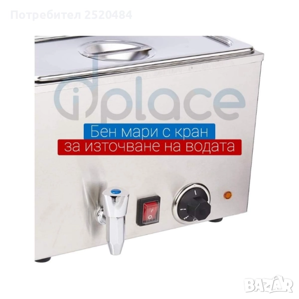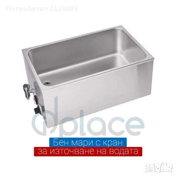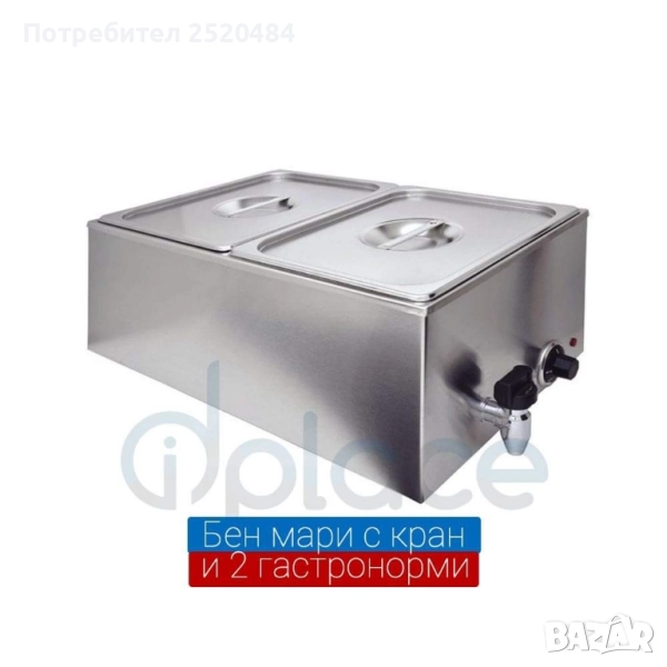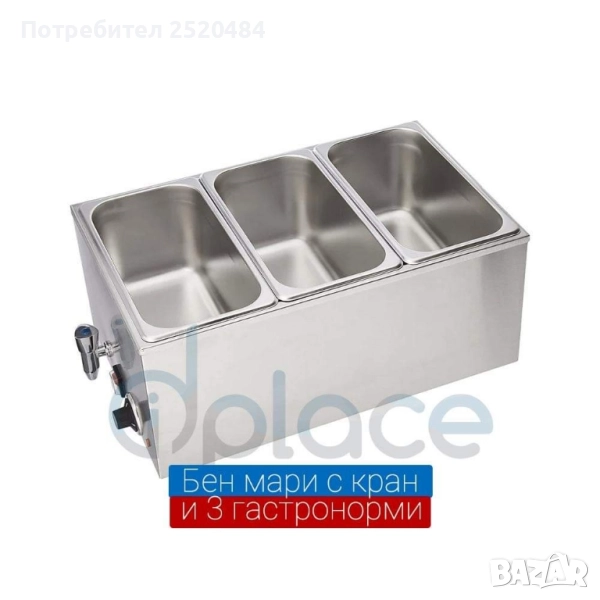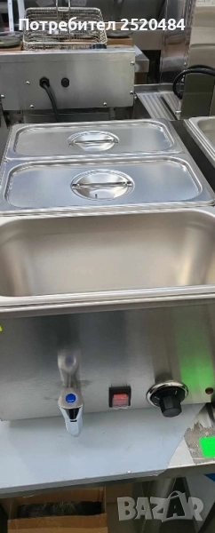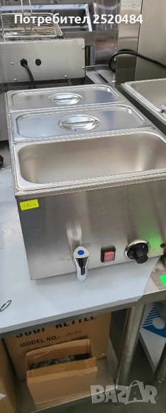 Бен Мари от неръждаема стомана на водна баня. Чисто нови с гастронорми. 6 модела! Топли витрини Бен Мари са перфектното попълнение в търговското оборудване на всяко заведение за хранене или търговски обект. Моделите са практични и функционални, когато искате да изложите топли хранителни продукти, които да бъдат с идеалната температура за запазване на техните вкусови качества. Витрините разполагат с тави и капаци от неръждаема стомана /гастронорми/. Почистват се лесно и са с функционални размери. 1 ви Модел: - с пет вани /гастронорми 1/2 с дълбочина 10см/ - електрическа - работна температура от 30 до 90° - термостат - със стъклена витрина - мощност: 1,8Kw, 220V - размери на гастронормите 32,5×26×10см /дълж.шир.вис/ - габаритни размери на витрината 143,5×35×31,5см / дълж.шир.вис/ - изцяло от неръждаема стомана - цена 489лв/250,02€ с ДДС - 12 месеца гаранция 2 ри Модел: - с четири вани /гастронорми 1/2 с дълбочина 10см/ - размери на гастронормите 32,5×26×10см / дълж.шир.вис/ - електрическа - работна температура от 30 до 90° - термостат - със стъклена витрина - мощност: 1,5KW/220V - габаритни размери 120×35×31,5см /дълж.шир.вис/ - изцяло от неръждаема стомана - цена с ДДС 449лв/229,57€ с ДДС - 12 месеца гаранция 3 ти Модел: - с три вани /гастронорми 1/2 на 10см дълбочина/ - размери на гастронормите 32,5×26×10см /дълж.шир.вис/ - електрическа - със стъклена витрина - изцяло от неръждаема стомана - цена с ДДС 369лв/188,67€ 4 ти Модел: Бен мари с 3 броя гастронорми 1/3 с дълбочина 15см с капаци Модел: ZCK165AT-3 Техническа спецификация: - изцяло от неръждаема стомана - габаритни размери 540х340х250мм - размер на 1бр. гастронорма 1/3: 325х176х15см - с кран за източване на водата - регулиране на температурата - мощност: 230V / 50Hz / 1200W - гаранция: 12 месеца - цена 300лв/153,45€ с ДДС 5 ти Модел: Бен мари с 2 броя гастронорми 1/2 с дълбочина 15см с капаци Модел: ZCK165AT-2 Техническа спецификация: - изцяло от неръждаема стомана - габаритни размери. 540х340х250мм - размери на гастронорма 1/2 325х265х15см - с кран за източване на водата - регулиране на температурата - мощност: 230V / 50Hz / 1200W - гаранция: 12 месеца - цена 290лв/148,33€ с ДДС 6 ти Модел: Бен мари с една гастронорма 1/1 и капак 210.00лв. Модел: ZCK165AT-1 Техническа спецификация: - размер на гастронормата 530х325х15см - изцяло от неръждаема стомана - с кран за източване на водата - регулируем термостат мощност: 230V / 50Hz / 1200W - габаритни размери: 540х340х250мм - гаранция: 12 месеца - цена 280лв/143,16 с ДДС Възможна доставка по Еконт!