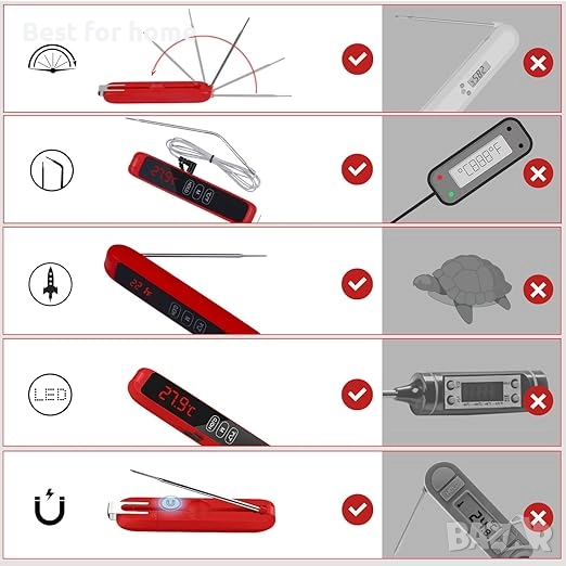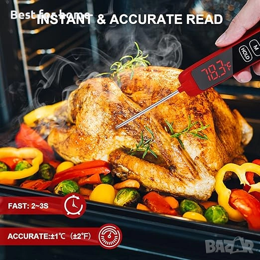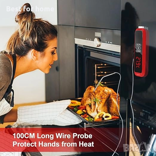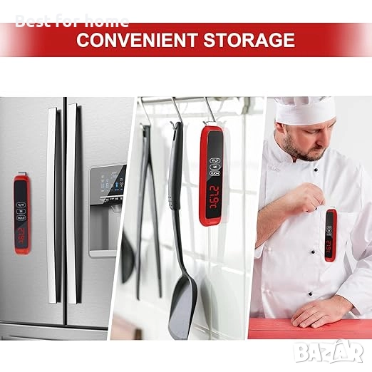 Безопасност и лекота на употреба: термометърът има вградени магнити на гърба и отвори за окачване за хладилници и кукички, които улесняват съхранението и намирането на термометри за барбекю. Освен това има дълъг експлоатационен живот и издръжливост, а подобрените висококачествени материали гарантират, че храната ви е по-здравословна.