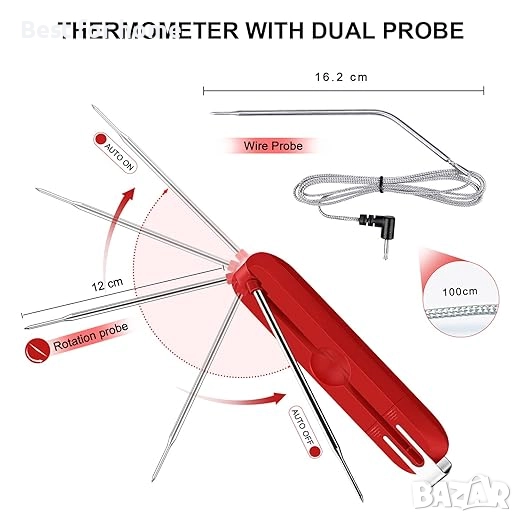 2 в 1 двойна сонда: Този дигитален термометър за грил има две безопасни сонди от неръждаема стомана, които могат да отговорят на всички ваши изисквания за измерване на температурата в кухнята. Сгънатата на 180 градуса сонда (с дължина 4,7 инча) започва да отчита температурата веднага след разгъване. Термометърът за месо е оборудван и с кабелна сонда, подходяща за фурна (с дължина 45,9 инча), която може да се използва в грила/фурната за измерване на температурата на фурната.