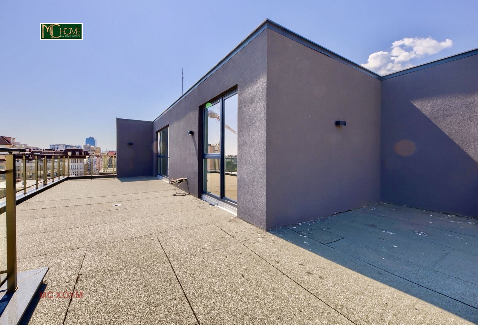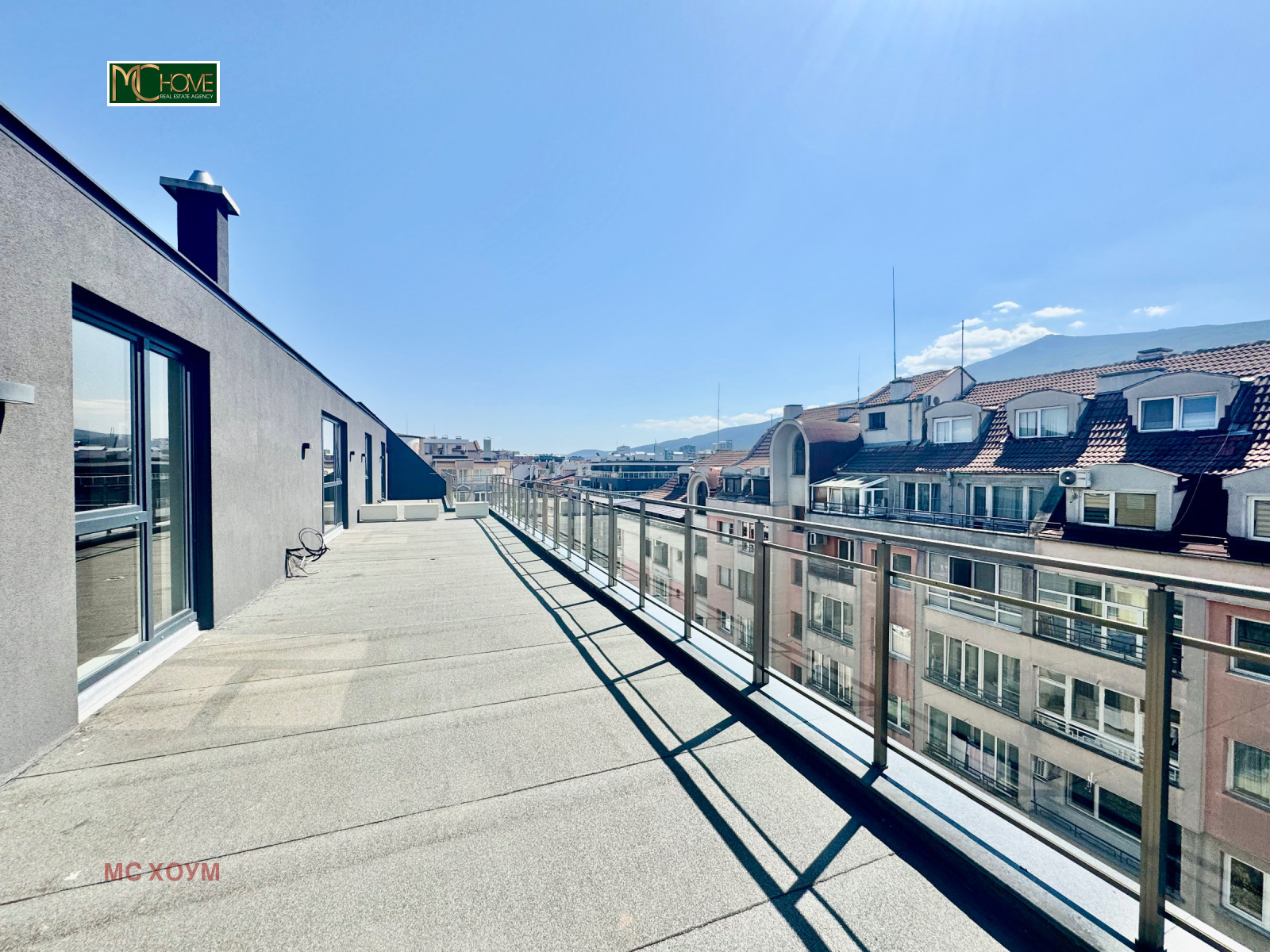 Жилището е със застроена площ 126кв.м и е със следното разпределение: просторна дневна с кухненски бокс, две спални, като едната разполага с гардеробна, две бани с тоалетна, кабинет, панорамна тераса с площ 151кв.м.