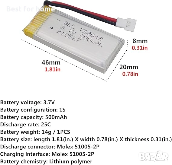 Батерията 3.7V 800mAh LiPO е резервна батерия. Тя ще осигури по-МОЩНА и ЗДРАВА производителност благодарение на по-високия си изходен ток и мощност. Високият капацитет може да накара вашия дрон да показва разнообразни трудни движения.