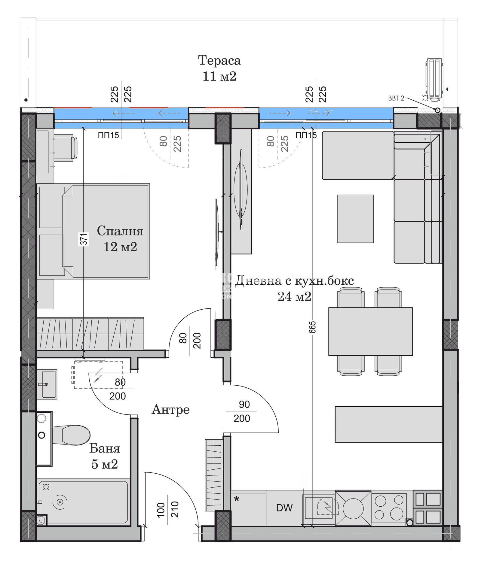 Предлагаме на вашето внимание двустаен апартамент в новоизградена, иновативна и модерна сграда със собствен стил с изчистена визия, проектирана така, че да създаде максимален комфорт и уют за живеене. Жилището се състои от дневна 24кв.м. с трапезария и кухненски бокс, една самостоятелна спалня 12кв.м., баня с тоалетна, антре с място за гардероб и една обща панорамна тераса 11кв.м. Проектът предвижда застрояване, просторни и панорамни жилища, вътрешен двор с оформени зелени зони за релакс и почивка. Сградата привлича вниманието със своята локация, разположена в близост до Гребна база и парк Отдих и култура, обособили се като едни от най-развиващите се и предпочитани райони за живеене в града, както и до няколко от най-добрите болници, а именно ( Пълмед, Селена, Хирургиите ). В близост до сградата има големи хранителни магазини, детска градина, училище, автобусни спирки и всичко необходимо за едно нормално ежедневие. Инвеститора осъществява сгради, които задават нов стандарт в жилищното строителство. Комбинирайки модерни технологии, безкомпромисно качество и прецизен дизайн, за да осигурим среда, която предлага комфорт, естетика и функционалност. Сградата ще бъде с ИЗЦЯЛО окачена, ВЕНТЛИРУЕМА ФАСАДА с енергийна ефективност от висок клас, система УМЕН ДОМ, високоскоростни асансьори, както и към всяко паркомясто ще има прекаран трифазен ток за поставяне на ЗАРЯДНА СТАНЦИЯ за електроавтомобили, Видеонаблюдение, най-висок клас блиндирани врати за висока степен на сигурност, master key система за още по-сигурен контрол на достъп, автоматизирани системи против пожари , които осигуряват бърза реакция в случай на необходимост. Паркирането е решено с голям подземен както и надземен паркинг като има голям избор на паркоместа и гаражи. Гъвкави схеми на разсрочено плащане в рамките на строителството, както и съдействие за банково кредитиране с изключително изгодни условия за клиенти на агенция !!!