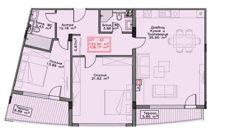 Представяме на Вашето внимание тристаен апартамент находящ се на трети жилищен етаж, състоящ се от коридор, просторна всекидневна с кухненски бокс и трапезен кът, две спални, две бани с тоалетни, две тераси и избено помещение.