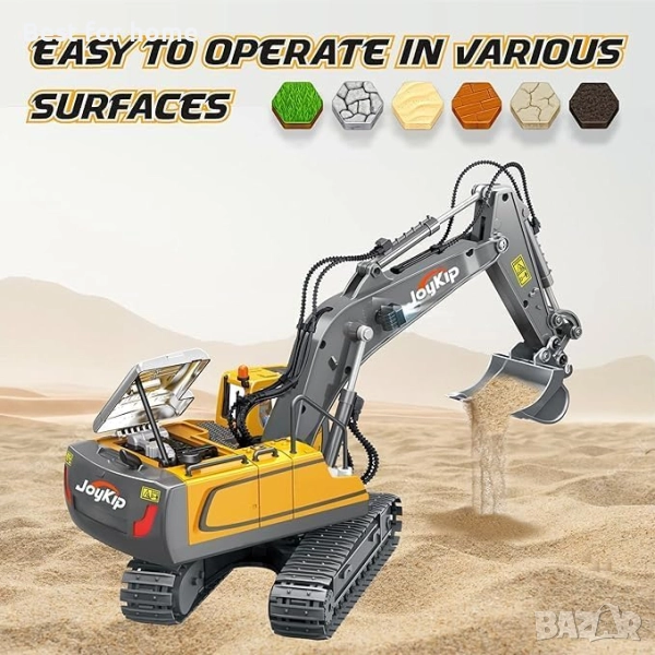 Звукова функция и предни фарове: Радиоуправляемите багери JoyKip имат опция за активиране на звуковите ефекти, за да оживят играта ви и да осветят пътя ви с предните фарове.
