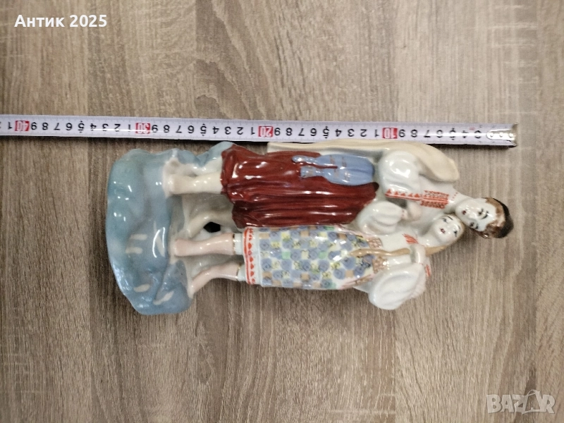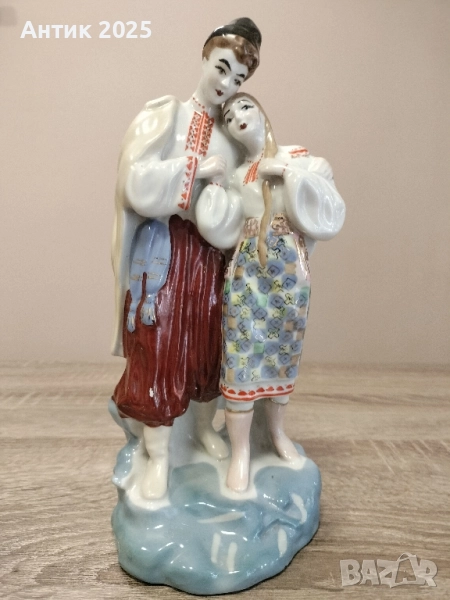 Рядка колекционерска фигурка, произведена в Полонския завод за художествена керамика (Украйна, СССР). Изобразява влюбена двойка в традиционни украински народни носии. ✨ Материал: порцелан, ръчно рисуван ✨ Години на производство: 1950–1970 г. ✨ Състояние: отлично, без отчупвания и пукнатини Елегантна изработка, подходяща както за колекция съветски порцелан, така и за стилна украса на интериора.
