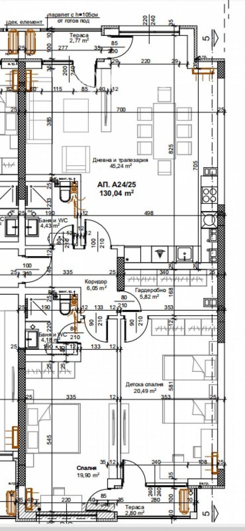 Апартаментът се състои от : голяма, просторна и светла дневна с трапезария и кухненски бокс (45 кв.м.) с гледка към парка и с достъп до тераса- лоджия; две големи спални, всяка от по 20 кв.м. и с излаз на тераса- лоджия, една със собствен санитерен възел; втори санитарен възел и гардеробно.