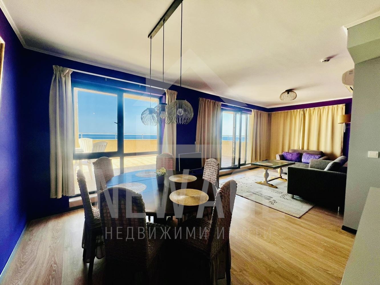 Разпределението включва просторна дневна с трапезария и напълно оборудван кухненски бокс, три самостоятелни спални, две бани с тоалетни и няколко тераси с фронтален изглед към морето. Апартаментът се продава напълно обзаведен и оборудван, в отлично състояние готов за нанасяне веднага, без нужда от допълнителни разходи.