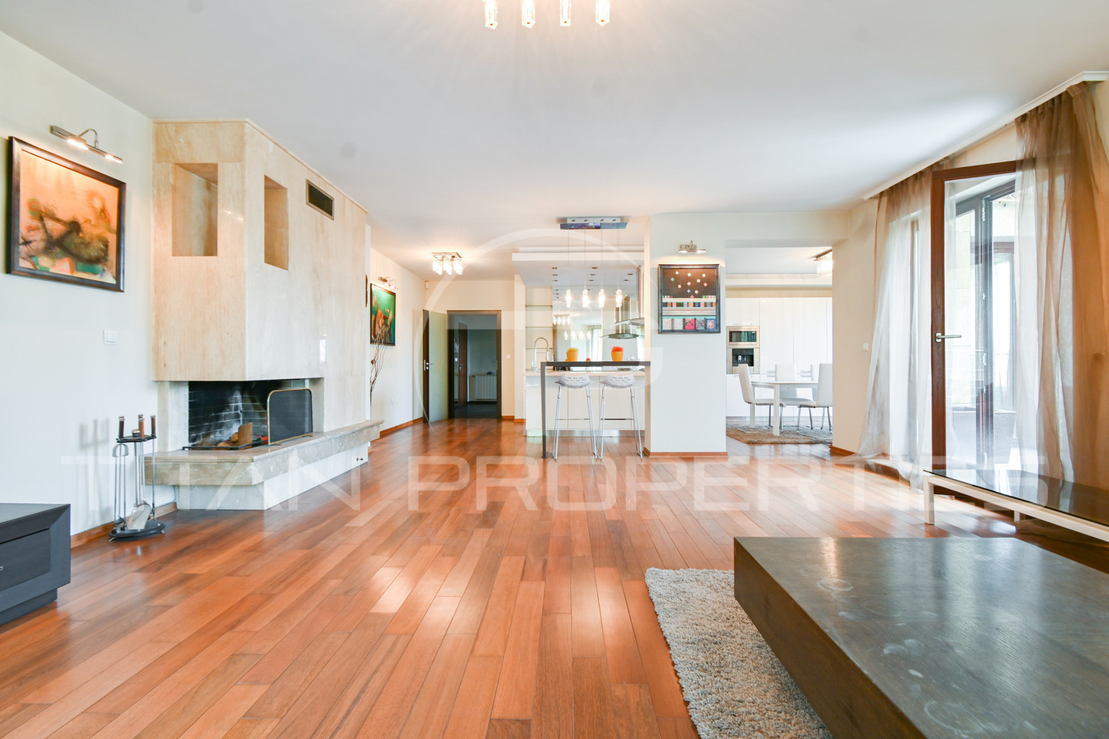 Подовата настилка във всички помещения е от естествен дъбов паркет, отоплението е на газ, но има и камина за жив огън в голямата дневна. Апартаментът разполага и със соларен панел за топла вода. Продава се обзаведен с всичко необходимо за едно домакинство, с изключение на 3 от стаите, които може да обзаведете изцяло по Ваш вкус и стил.
