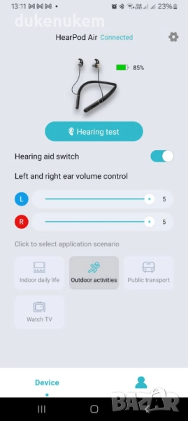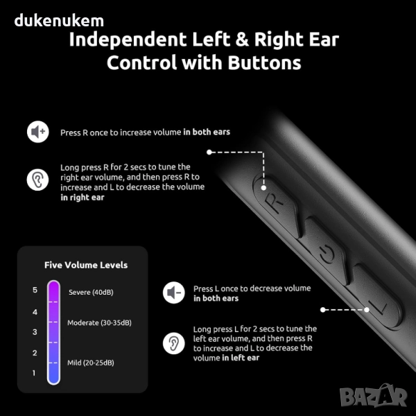 Независим контрол на звука за ляво и дясно ухо (5 степени).
