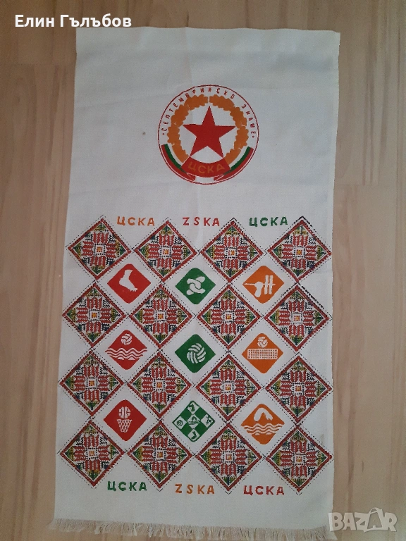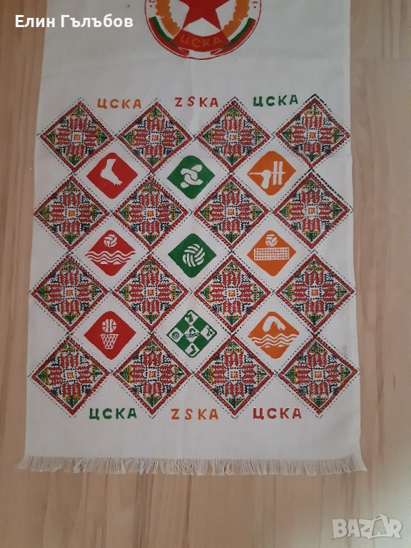 Интересното на тази бродирана кърпа на ЦСКА"Септемврийско знаме" е,че между обозначението на даденият вид спорт има отново бродирана български шевици.Кърпата на ЦСКА"Септемврийско знаме" е УНИКАЛНА и,като ръчна изработка и като колекционерска находка.Невероятно и истинско рядко попадение за любители,фенове и колекционери.В перфектно състояние и вид без абсолютно никакви дефекти или някакви забележки тази кърпа е пазена,като скъпа реликва и мил спомен от хегемона ЦСКА"Септемврийско знаме".
