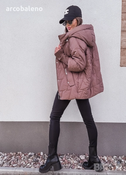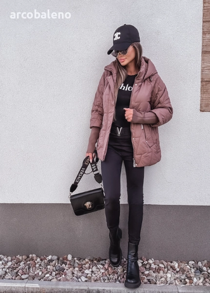 Дамско ватирано яке с качулка и ръкави тип пуловер
