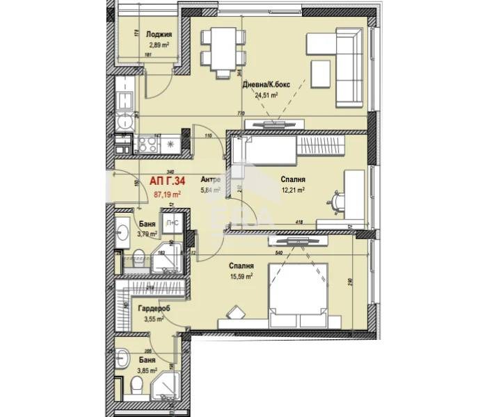 Представяме на вашето внимание двустаен апартамент 34 в сграда Г, включващ светла дневна с кухненски бокс, две спални, гардеробна, две бани с тоалетна, антре, лоджия и склад.