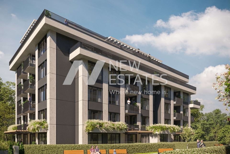 New Estates представя на Вашето внимание двустаен апартамент в луксозна, функционална и екологична жилищна сграда, ситуирана в Южната част на град София. Локацията е изключително комуникативна с осигурен бърз достъп, както до административната част на града, така и до редица културни, спортни и обществени зони. Сградите са хармонично вписани между парк Витоша и градската среда на столицата. Поддръжката ще се осигурява от професионална компания, отговаряща за цялостния процес по почистване на общи части и фоайета, асансьори, озеленяване и аранжиране на парковата среда, сметоизвозване и снегопочистване. Ще бъде изградена съвременна и модерна детска площадка в безопасна среда без автомобили. Паркирането е решено на две нива, като има възможност за избор на единични или двойни гаражи и паркоместа.