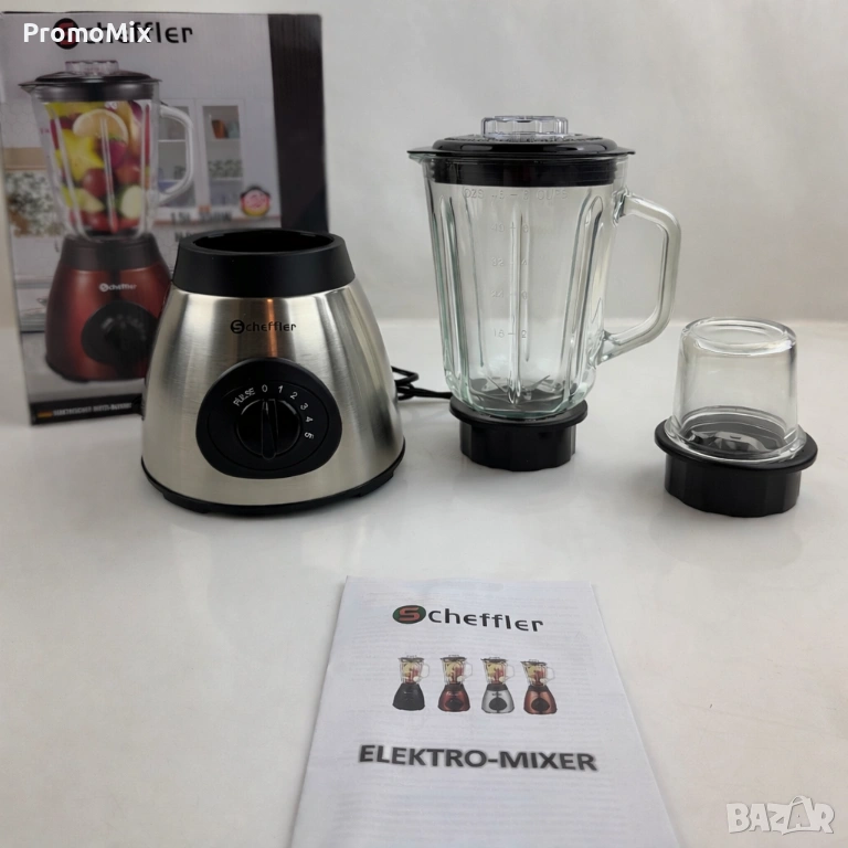 Scheffler 1104 е блендер, който комбинира 2 уреда в 1 с основна стъклена кана и капацитет 1.5 литра за пасиране и смесване, както и чопър със стъклен контейнер от 200 мл за мелене на ядки, кафе, подправки и др.