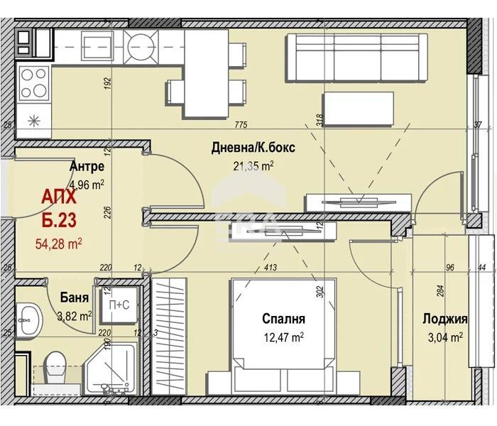 Представяме на вашето внимание двустаен апартамент 23 в сграда Б, включващ светла дневна с кухненски бокс, спалня, баня с тоалетна, антре, лоджия и склад.