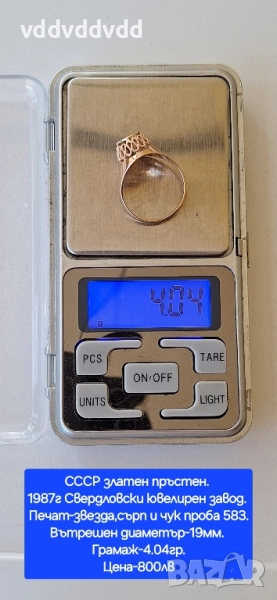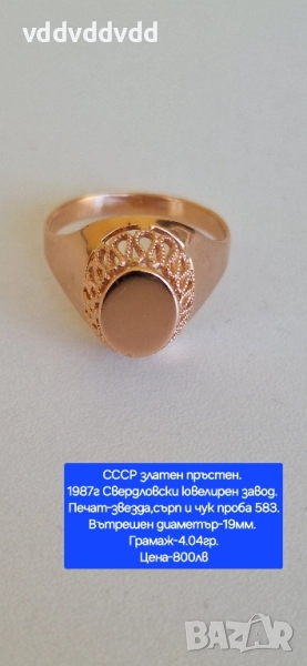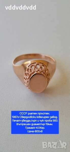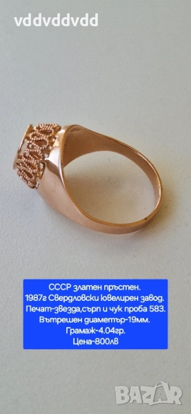 СССР златен пръстен. 1987г Свердловски ювелирен завод. Печат-звезда,сърп и чук проба 583. Вътрешен диаметър-19мм. Грамаж-4.04гр.