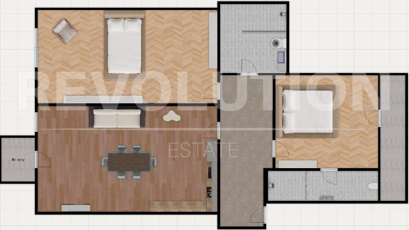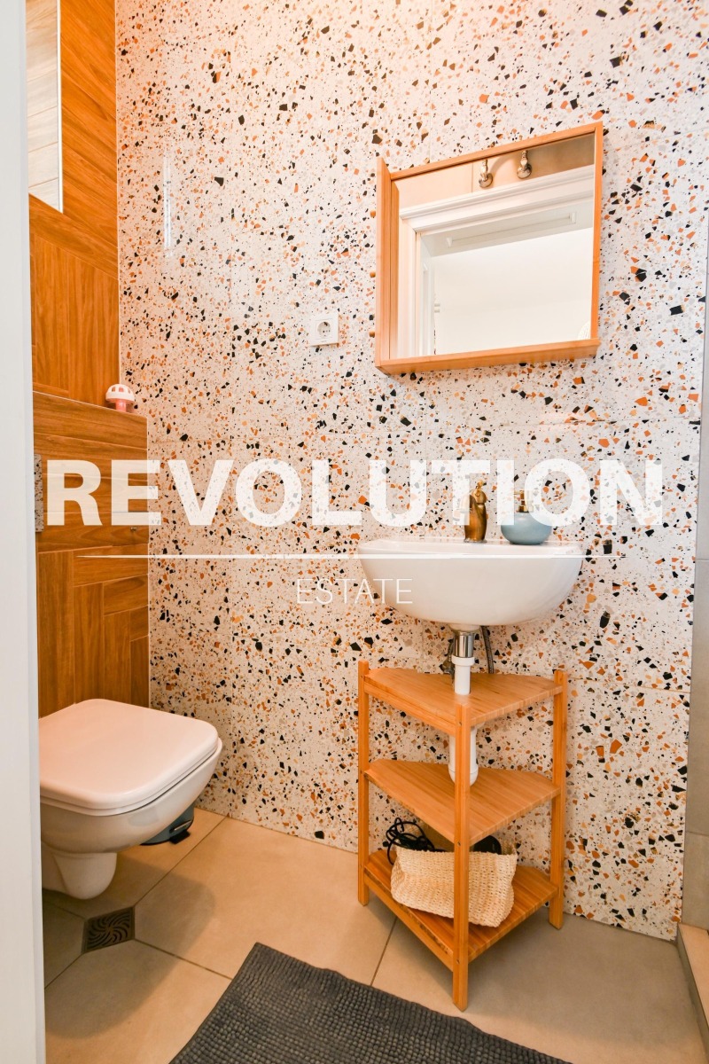 🔷 Разпределение: входно антре, хол с трапезария и кухненски бокс, две спални, две бани и тоалетни, две тераси.