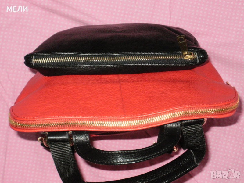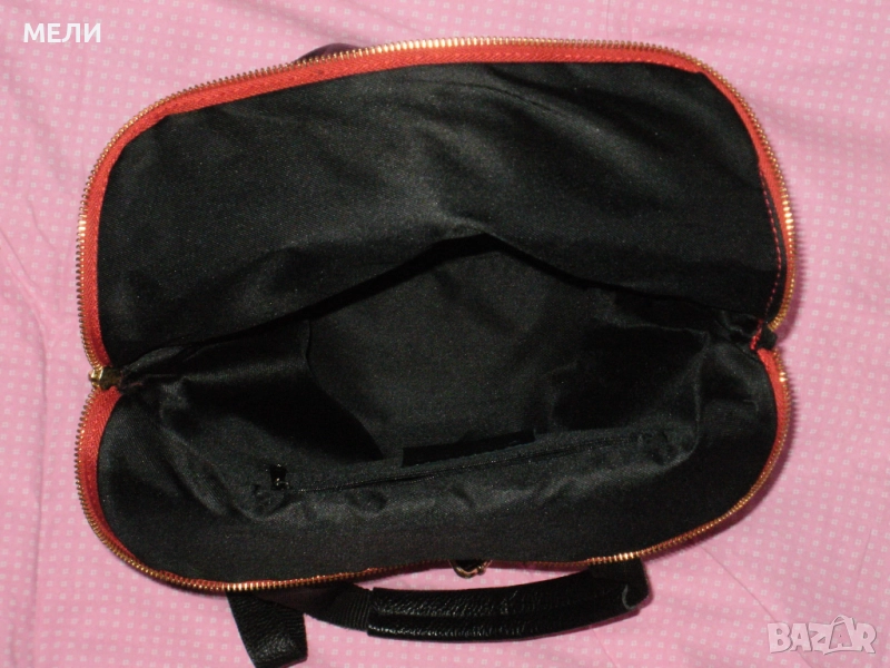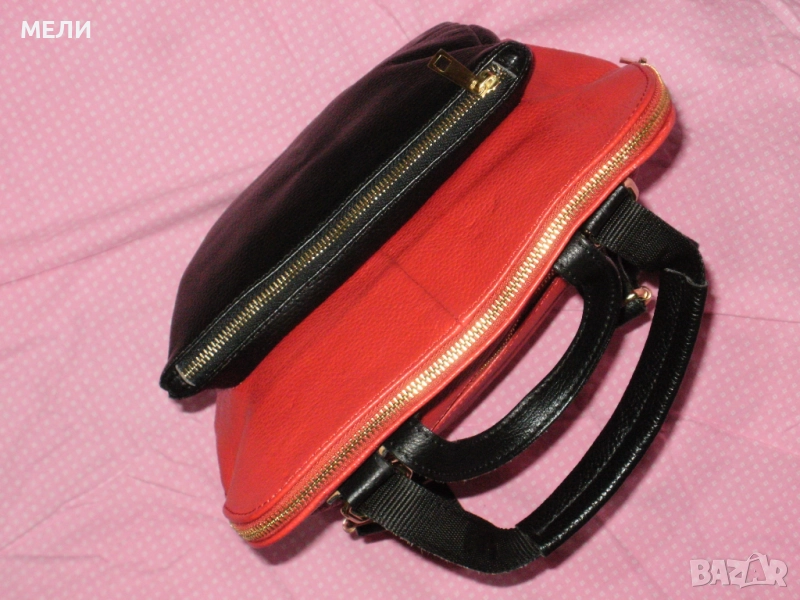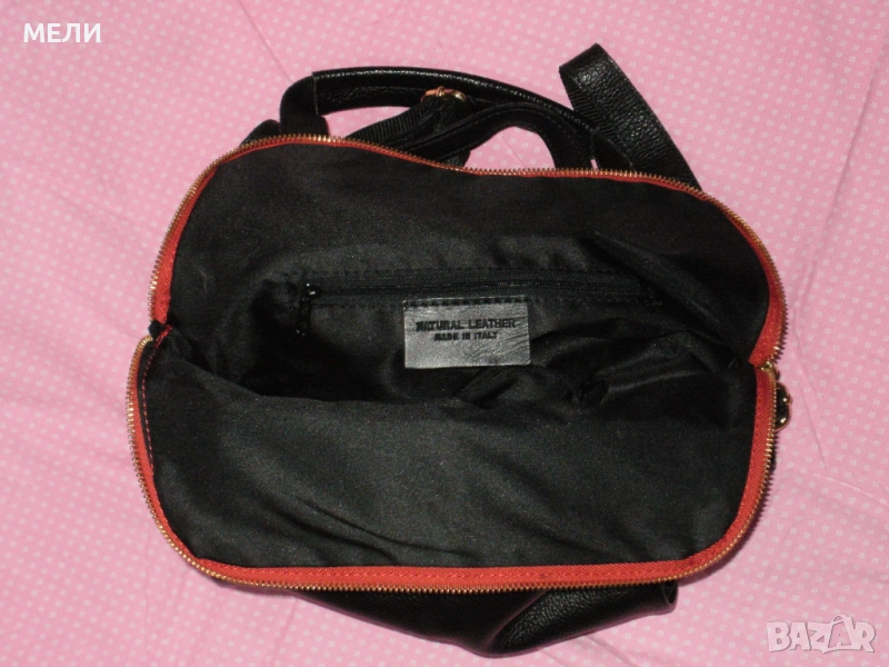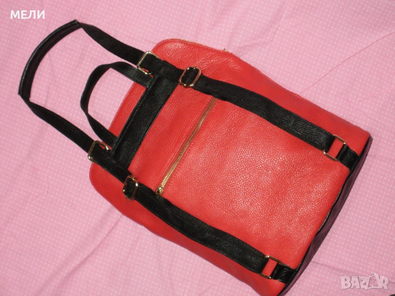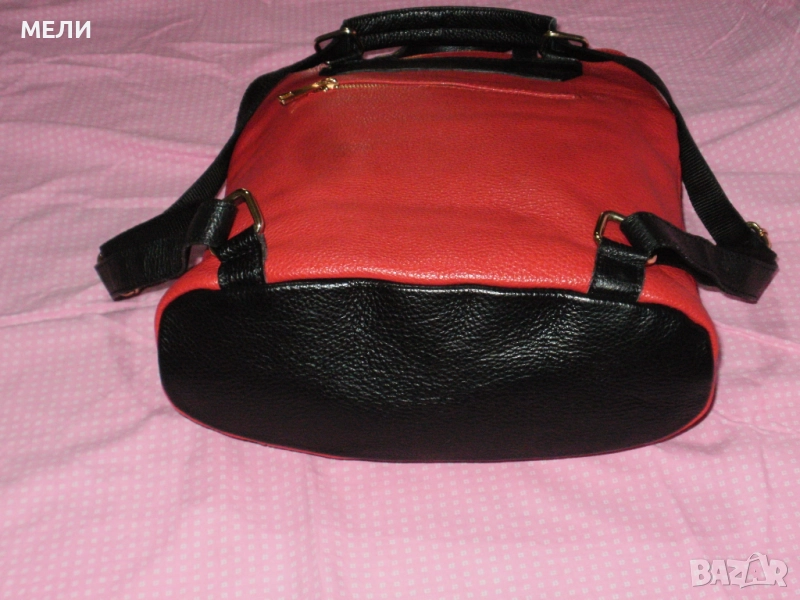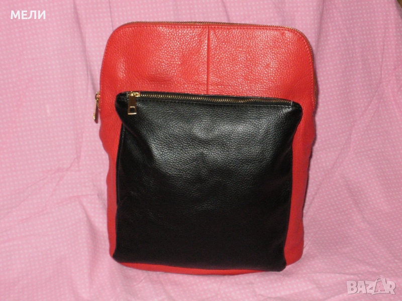 Раницата е дизайнерска, нова, страхотна, от стабилна естествена кожа. Произведена в Италия. Цветовете са червено и черно, класика. Средна големина, модела става и на чанта през рамо. Отпред има голям джоб с цип, отзад също джоб с цип. Отделно вътре е едно голямо отделение с три по малки джоба, много удобно. Обкова е в златно, много модерно. Презрамките се регулират с катарами.
