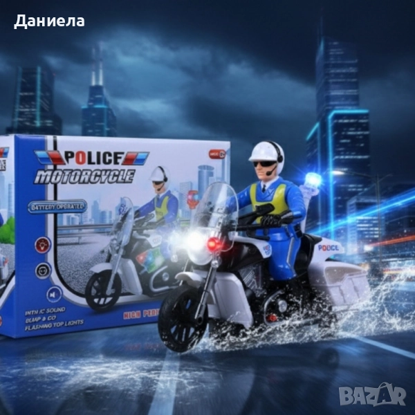 полицейски мотор. Звукови ефекти – реалистичен полицейски сиренен звук, който прави играта още по-жива. Размери на опаковката: 21 х 9 х 16 см; Размери на мотора: 20 х 9 х 16 см; Материал: нетоксична пластмаса; Захранване: 3 x 1,5V AA батерии (не са включени);