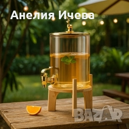 Материали и визия: прозрачно тяло; златисти детайли (капак и кран); естествена дървена стойка;