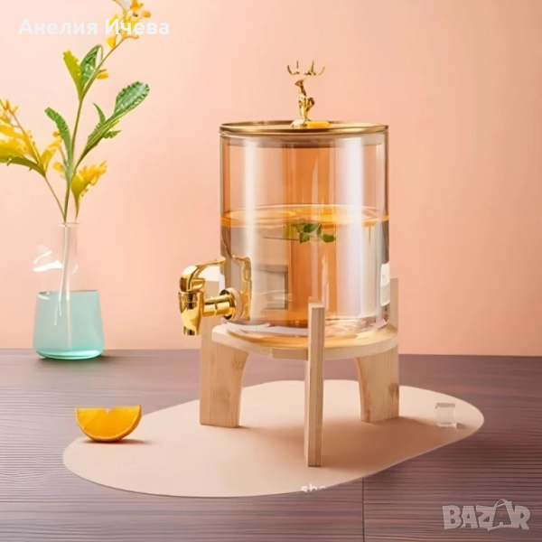 Комплектът включва: прозрачен съд, капак с дръжка „елен“, златист кран, стабилна дървена стойка;