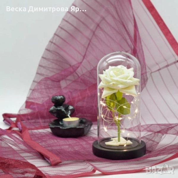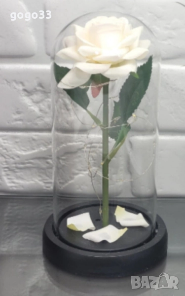 Бяла роза под стъклен купол - Вечна елегантност Цена: 20 лева(10.226 евро) Материали: Стъклен купол, дървена основа, синтетична роза; Осветление: LED светлини; Захранване: Батерии; Цвят на розата: Бял; Гаранция: 12 месеца.