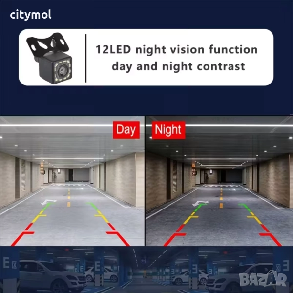 - 12 LED светлини: През нощта или в среда с ниска осветеност, 12 светодиода с висока яркост осигуряват силно осветление, което гарантира, че камерата може ясно да улови условията на пътя отзад и подобрява безопасността при движение на заден ход.