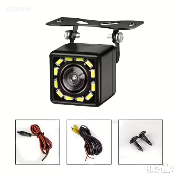 - Лесна за инсталиране: Целият комплект включва камера за задно виждане с 12 LED светлини, захранващ кабел, 6 м видео кабел и 2 винта.