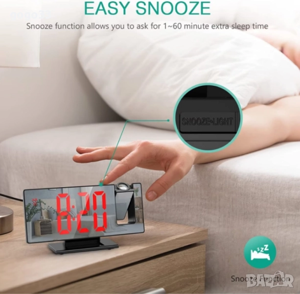 Настолен LED часовник със светещ проектор на тавана , аларма , будилник ТОП: Буквите на часовника са зелени,а на прожектора червен. Цена: 20 лева(10.226 евро) Цвят на корпуса: Черен, бял; Цифров дисплей за време: 12/24 часа; Нощен режим: Автоматично намаляване на силата на светене от 18:00 до 5:59; Проекция: 2 нива на регулиране на яркостта и изключване; LED часовник: 3 нива на яркост; Ъгъл на завъртане на проектора: 180 градуса; LCD дисплей: Показва време, температура, аларма; Захранване: На ток USB 5V - включен кабел; Размери: 185 х 74 мм.