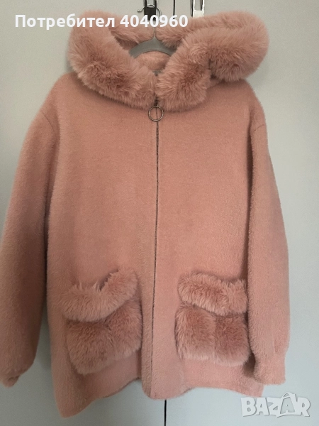 6. Мека кашмирена жилетка. С качулка пух и пухени джобове. Бебешко розово. Универсален размер овърсайз. Цена 35лв.