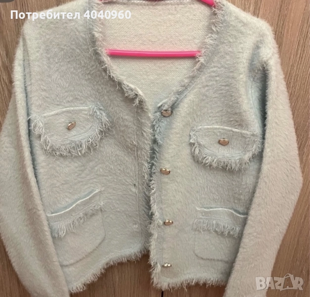 4. Дамско сако /жилетка/ от фино плетиво, лека и мека материя. Сезон пролет/есен. Подходящо за ежедневие и поводи. Два джоба. Останал цвят бебешко синьо. Стандартен размер.