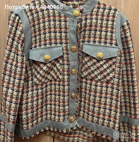 3. Дамско сако от букле. Подходящо за ежедневие и повод. Златни копчета и два джоба на гърдите. Сезон пролет/есен. Размер по етикет L, но няма еластичност и обхваща стандарния размер S,M,L. Състав : памук 10%, вискоза 10%, ликра 2%, полиестер 78%.