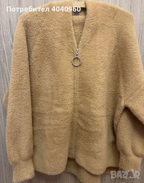 5. Бежова кашмирена жилетка (nude) с качулка. Изключително мека и топла материя. С два джоба и скрит цип. Отпред е с нормална дължина, задната част е леко по-дълга. Няма размер, но е уголемена и обхваща от L (Л) до XXL (2ХЛ).
