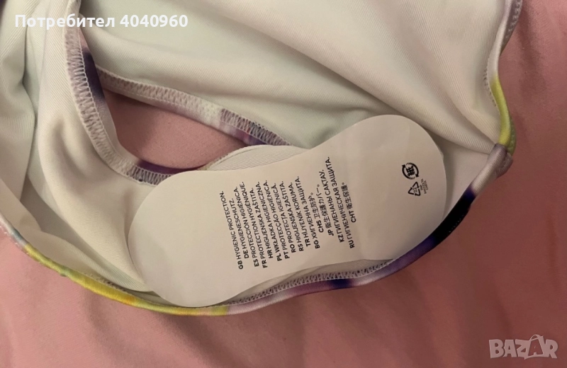 Нов бански с хигиенна лента на марката H&M, без етикет. Размер 50 (в снимката има таблица с размери според сайта). Подплатен, не прозира, с изваждащи се чашки. Възможност за завързване отпред около бюста и отзад на врата. Материал - полиестер и еластан.