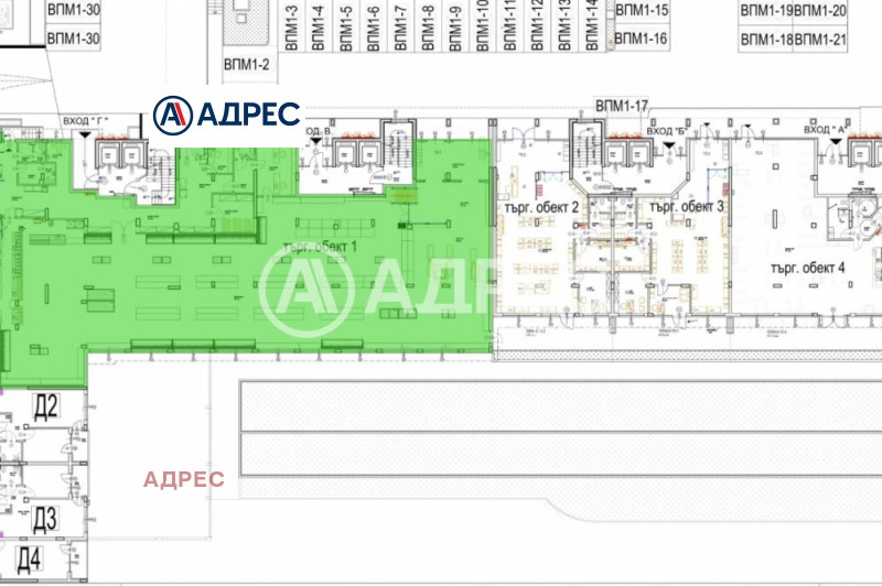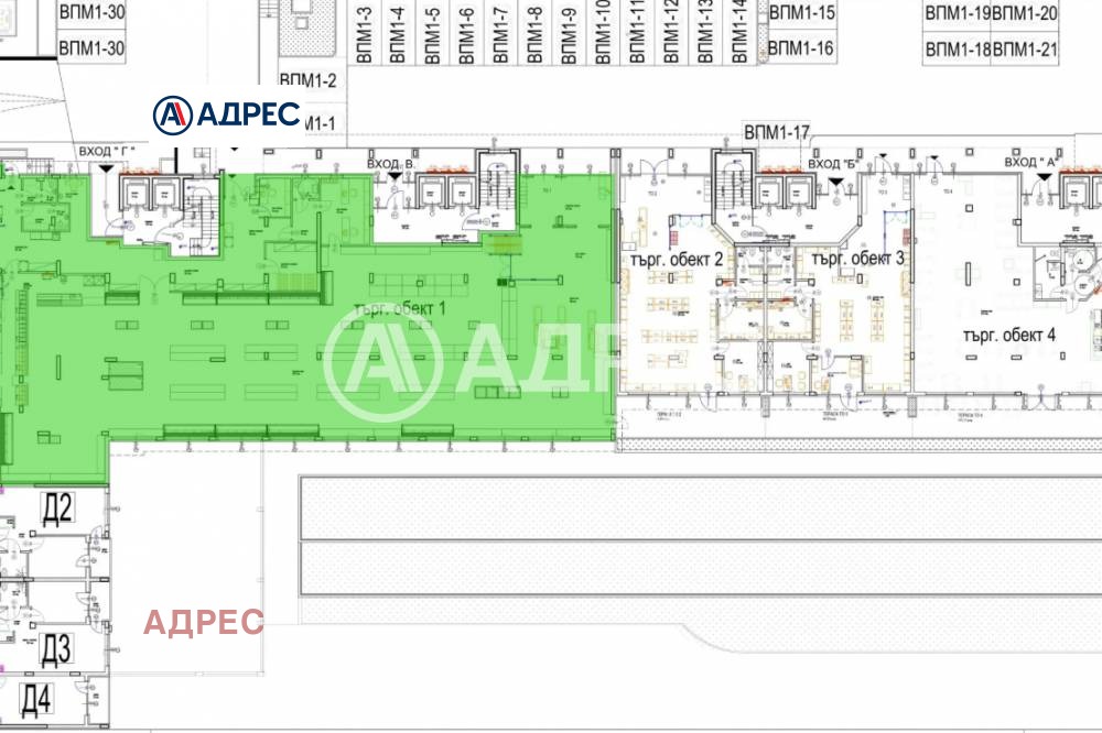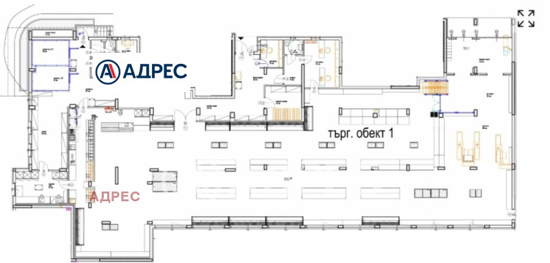 В продажба е голям търговски обект с площ 1078,31 кв.м в сграда в строеж.. Помещението е на партерно ниво с лице на две изложения и с два входа.