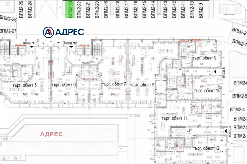 Проекта е с девет входа, 2 подземни етажа, партер с магазини и 8 етажа апартаменти.
