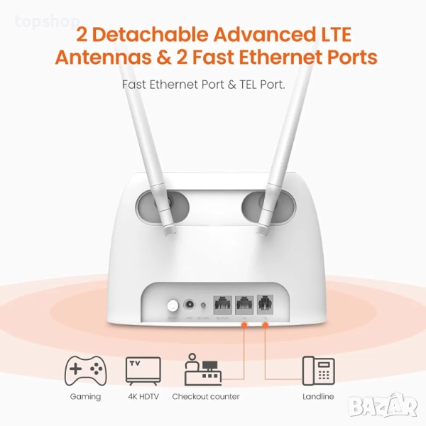 Интерфейси: 1 × 10/100 Mbps LAN/WAN порт, 1 × 10/100 Mbps LAN порт, 1 × 2FF слот за SIM карта;