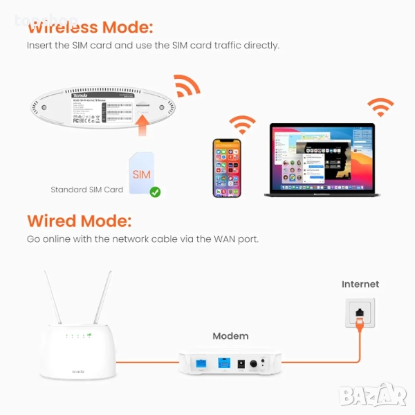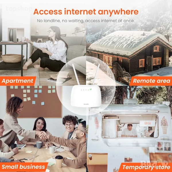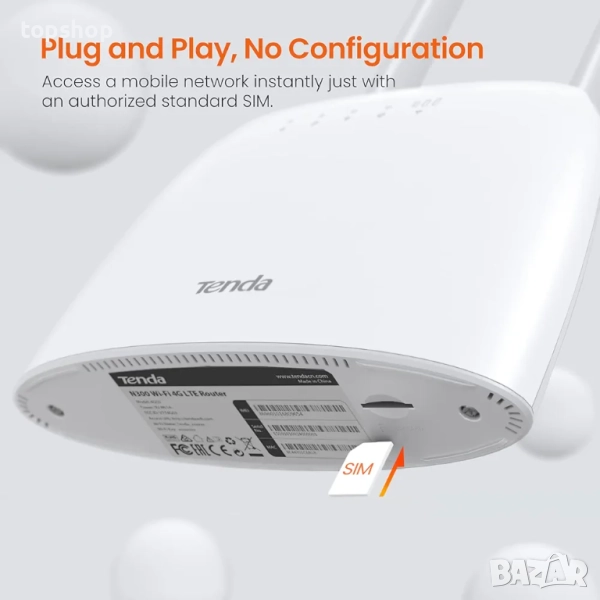 Рутерът Tenda 4G06 е с покритие на LTE сигнал за най-добра производителност и ви позволява да получавате достъп до интернет без кабел и оптична връзка.