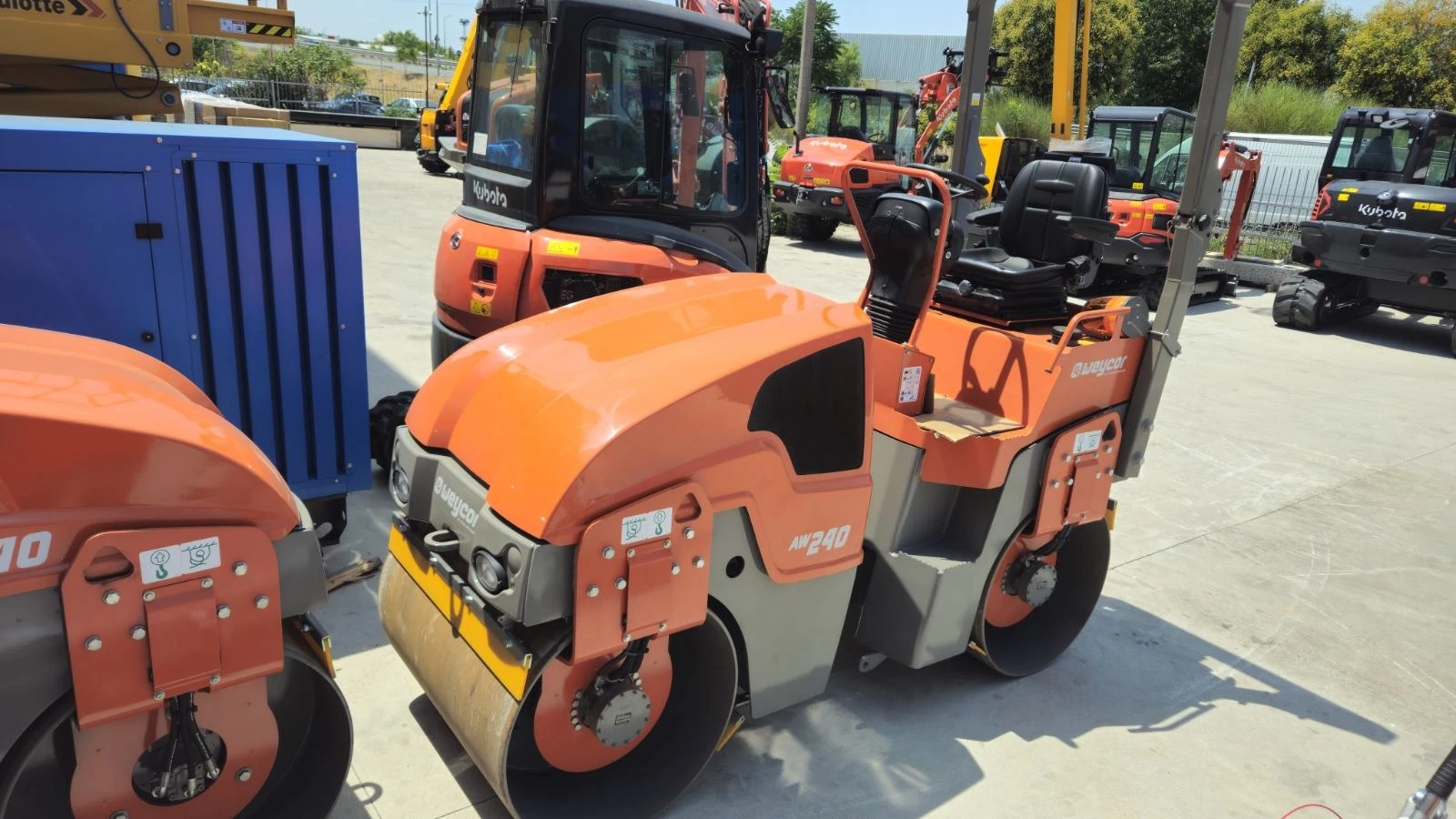 Двубандажен вибрационен валяк - WEYCOR AW 240 Нова машина, 0 моточаса - Работно тегло 2 700 кг - Двигател Perkins 403J-11, 18. 4 kW / (25 HP) - Ширина на бандажа 1 000 мм - Статичен линеен товар - 13. 5 kg/cm - Два режима на вибрациите: 53 / 61 Hz - Вибрационна сила, ниска / висока: 21. 5 / 28. 0 kN - Дебелина на бандажната черупка 12 мм - Воден резервоар 210 литра - Скорост 0 - 9 км/час - Теоретично преодолим наклон с вкл. / изкл. вибрации: 30 / 35 % Оборудван със: - Хидравлично задвижване и на двата бандажа; - Вибрации и на двата бандажа, с превключвател за 3 режима на работа - само преден вибриращ бандаж / само заден вибриращ бандаж / вибрации и на двата бандажа; - Странично отместени един спрямо друг бандажи ( Off set ) 50 мм, за удобство при работа в близост до бордюри; - Система за автоматичен старт/стоп на вибрациите; - Оросителна система с помпа и таймер; - Сгъваем ROPS ролбар; - Виброизолирана платформа за оператора (отделна конструкция от шасито, монтирана към него посредством гумени тампони); - Странично плъзгаща се седалка за оператора, със странични подлакътници, предпазен колан и сензор за седнало положение на оператора; - Заключващ се капак за инструменталното табло; - Работни светлини и сигнализационен буркан; - Аларма при движение на заден ход.