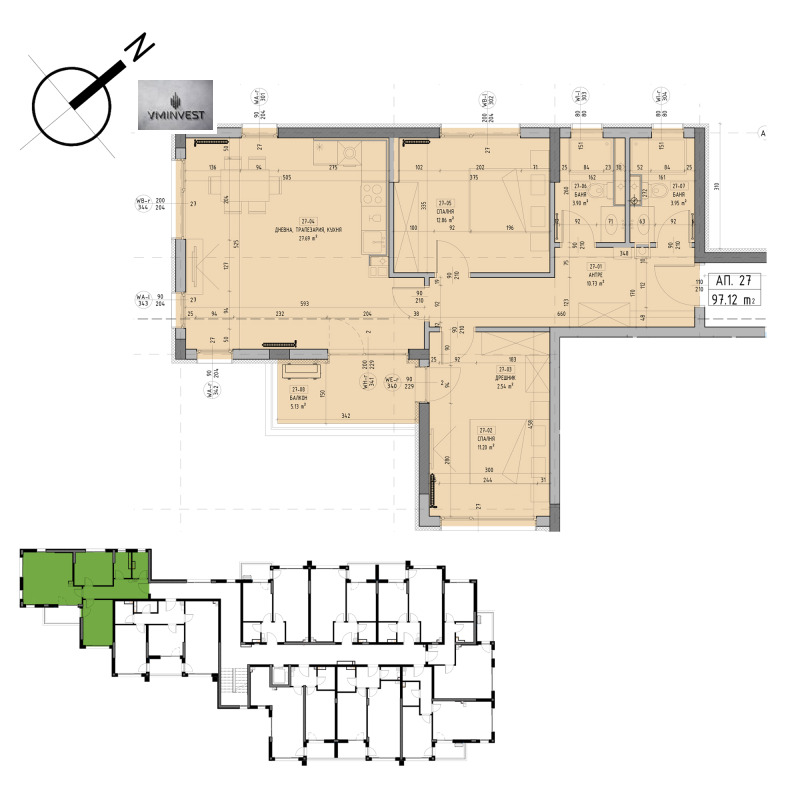 Апартаментът /Ап.27/ е с площ от 117,87 кв.м. и е на трети етаж.