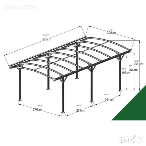 Размер: Височина на входа- 219 см от стълб до стълб, Дължина- 576 см, Ширина 300 см.