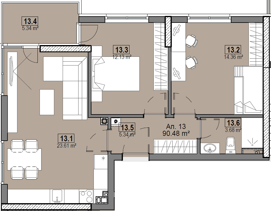 Разпределение: дневна с кухненски бокс, две спални, баня с тоалетна, коридор и тераса. Оптимално разпределение на помещенията, без загуба на пространство.