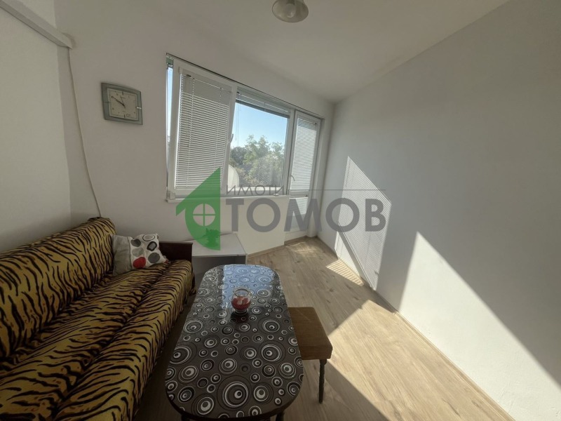 Имоти Томов представя на Вашето внимание двустаен апартамент под наем в района на Градската градина. Жилището е разположено на седми етаж в тухлена сграда с контрол на достъпа и асансьор.