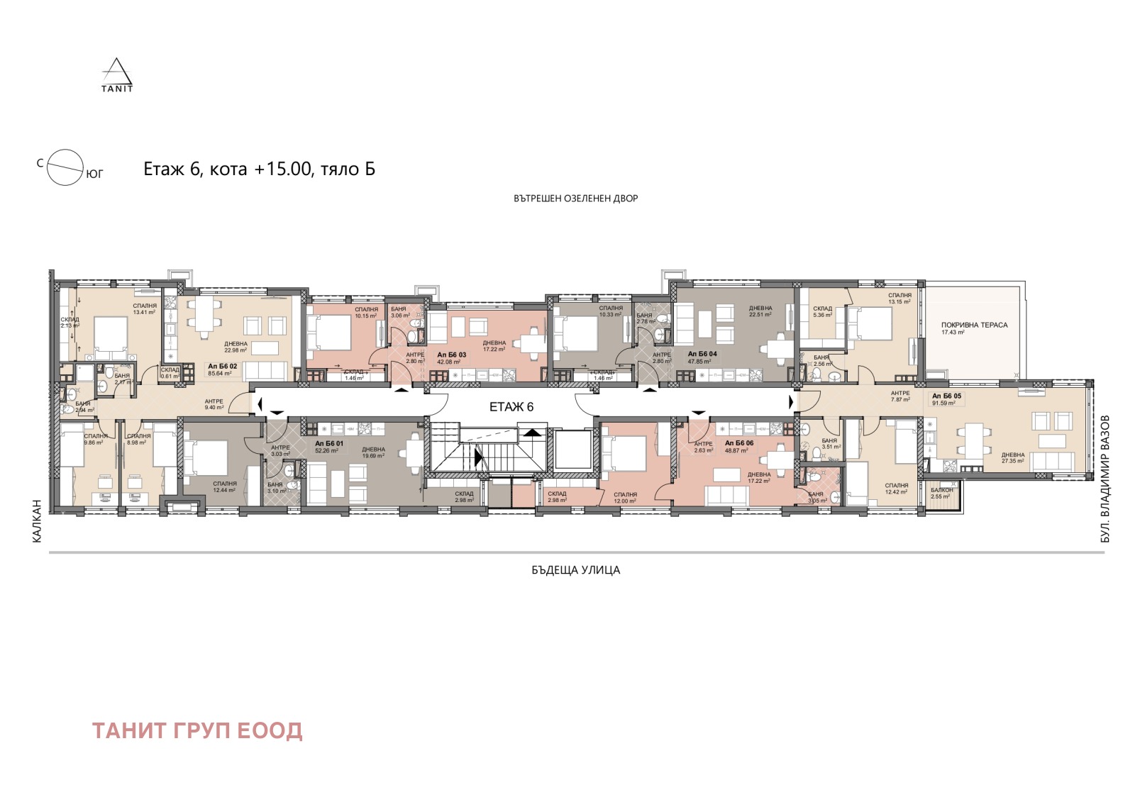 Предлагаме за продажба ап. Б6 03, двустаен, на шести жилищен етаж (кота +15,00м.) със ЗП 42 кв.м. (53кв.м. с вкл. общи части и склад от 3кв.м.) с източно изложение в новата ни сграда Lion Hill етап 2. Цената на апартамента е 127 000 евро с вкл. ДДС. В етап 1 и етап 2 все още има избор на едностайни, двустайни, тристайни, четиристайни апартаменти с различни големини и изложения, на различни етажи, както и паркоместа - разгледайте всички свободни обекти на уебсайта ни tanit.bg.