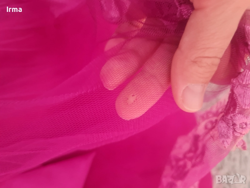 Официално рокля в цикломен цвят. Отговаря на размер М. Носена е веднъж за повод. Дълго я оглеждах за забележки и снимах само тези две дупчици по тюла, които изобщо не се виждат, когато е облечена. Затова и цената е толкова ниска.
