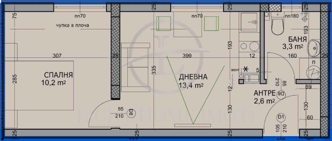 -Разпределение- Хол с кухненски бокс, спалня, баня с тоалетна, входно антре и избено помещение.