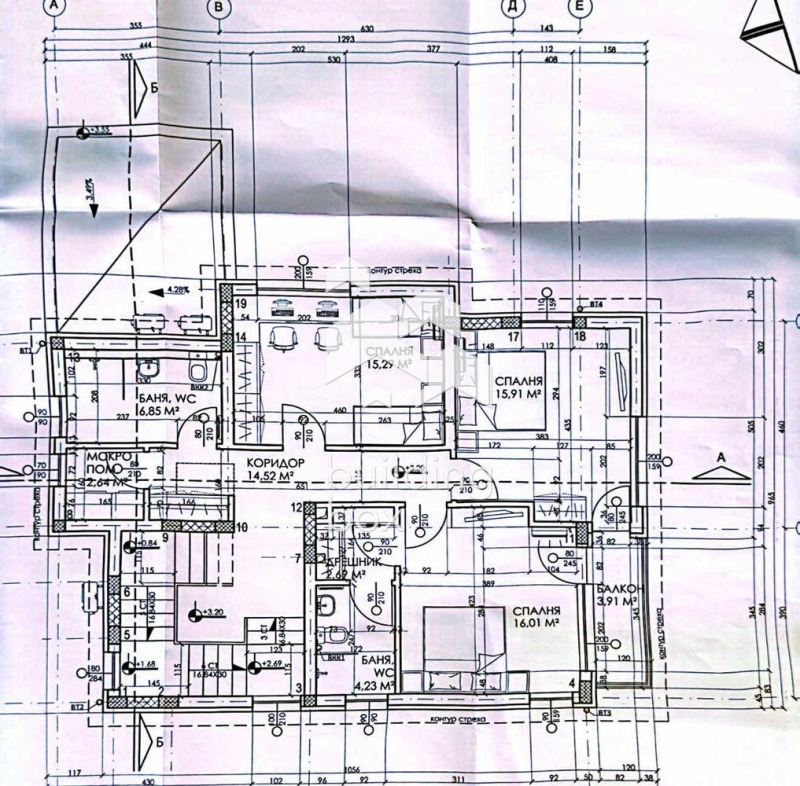 2. Втори етаж - Три просторни спални, едната от които е със собствена баня и тоалетна и дрешник, с излаз на тераса, коридор, перално помещение и още една баня и тоалетна.