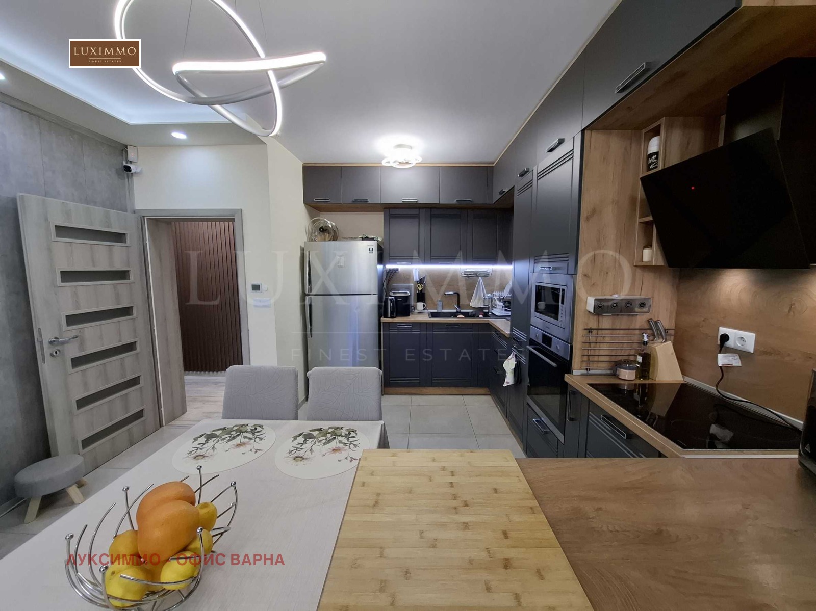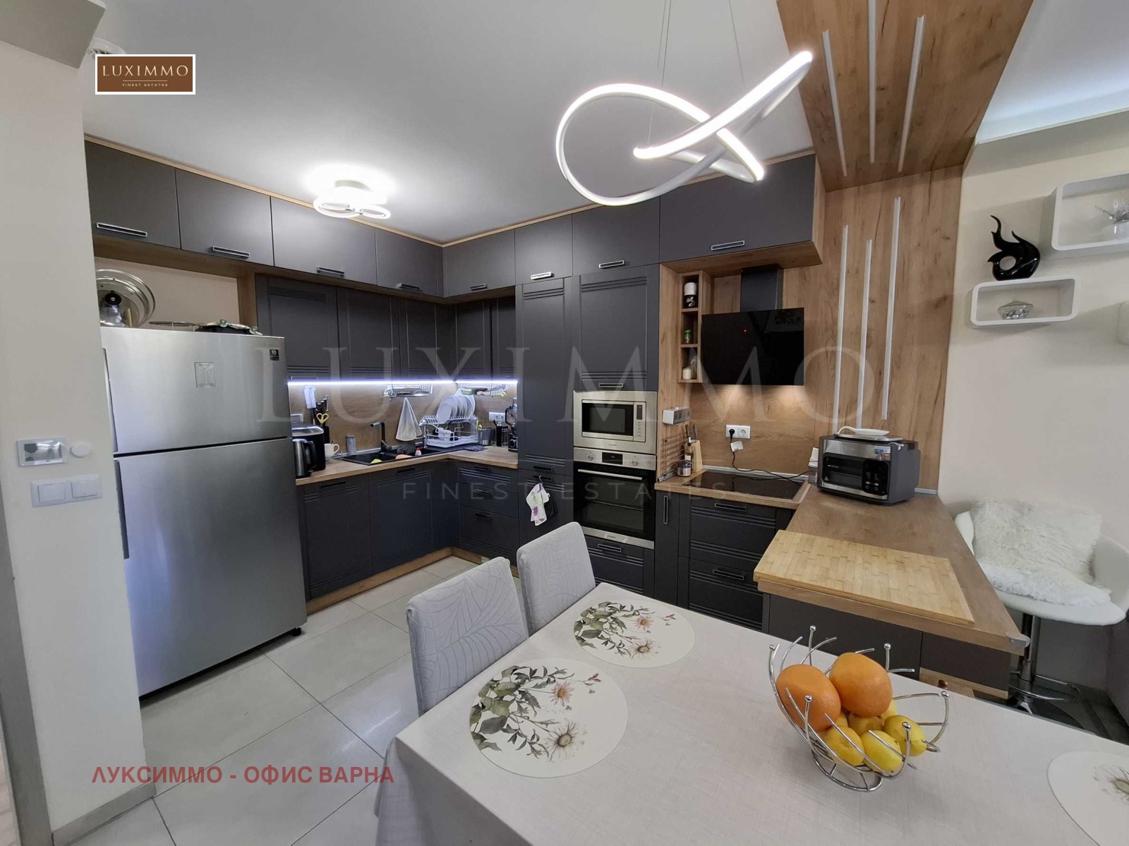 просторна дневна с трапезария и модерна кухненска част;
